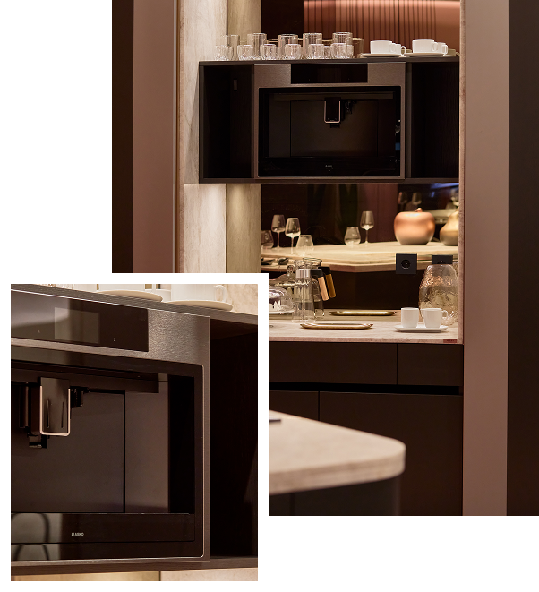 INKO Cocinas: cocina moderna de diseño premium con electrodoméstico empotrado, encimera clara y estantes iluminados con cristalería.