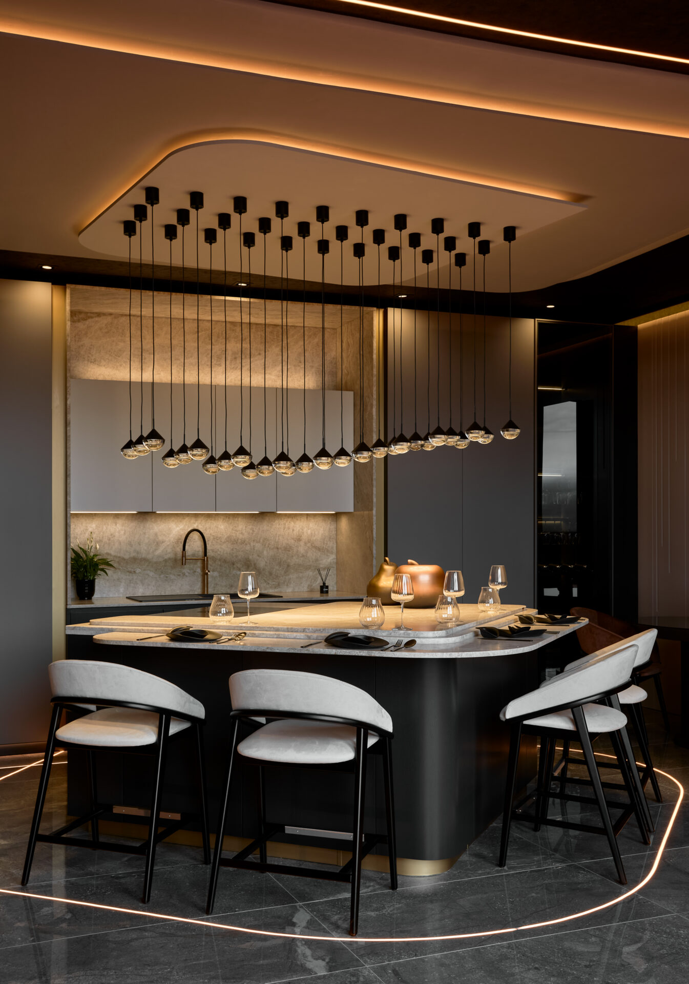 INKO Cocinas cocina premium con isla elegante, encimeras de mármol, gabinetes gris y luminarias colgantes de diseño moderno.