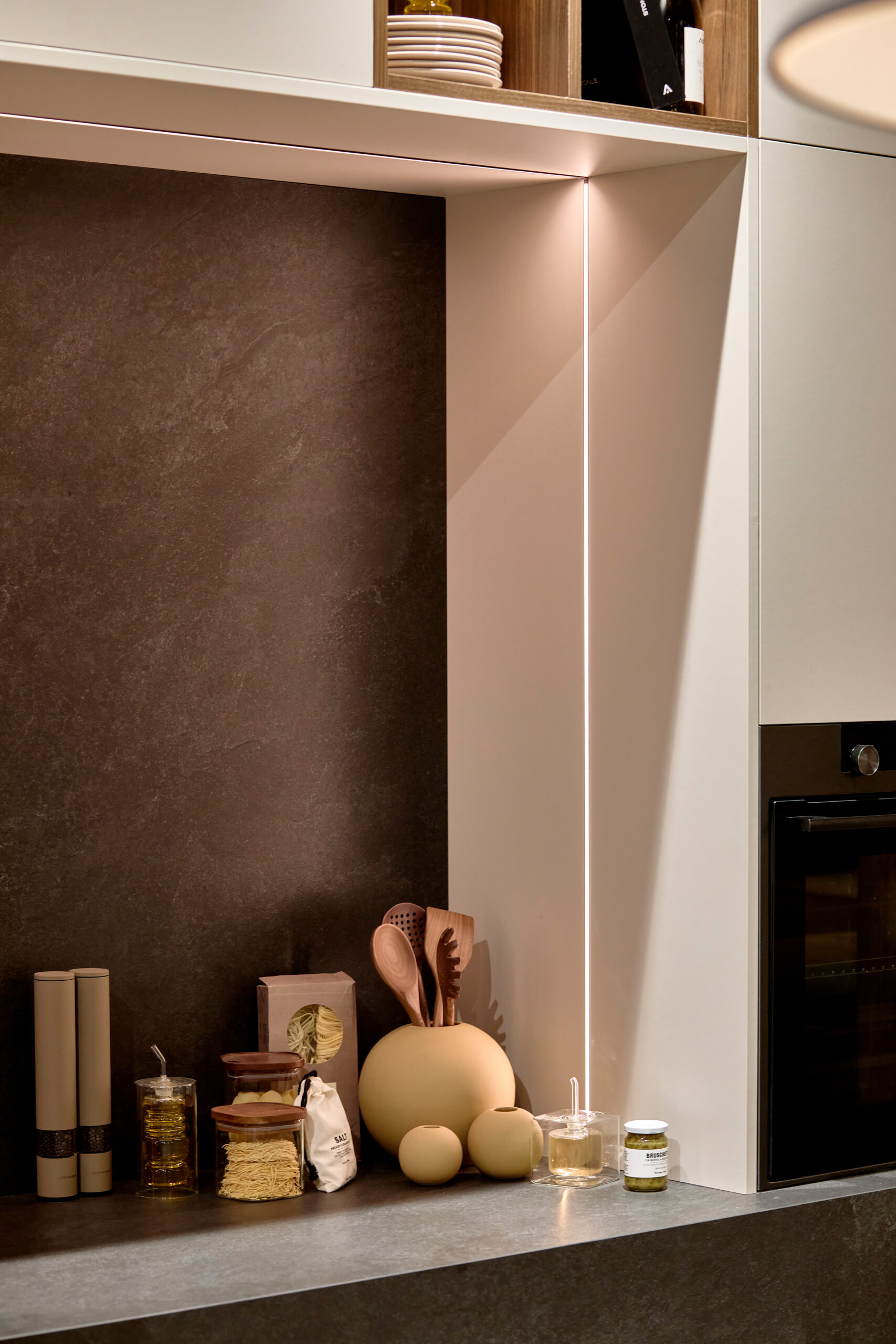 El proyecto se organiza en torno a una zona de columnas de 360 cm de altura, revestidas con frentes GOURMET acabado GINGER. Esta elección aporta una sensación de continuidad y ligereza, marcada por la verticalidad de las propias columnas. La calidez se introduce a través de las estanterías abiertas en UNIKA nogal, que enmarcan la zona de aguas central. Un detalle especialmente cuidado es la iluminación continua, que potencia la amplitud y refuerza la sensación de orden.