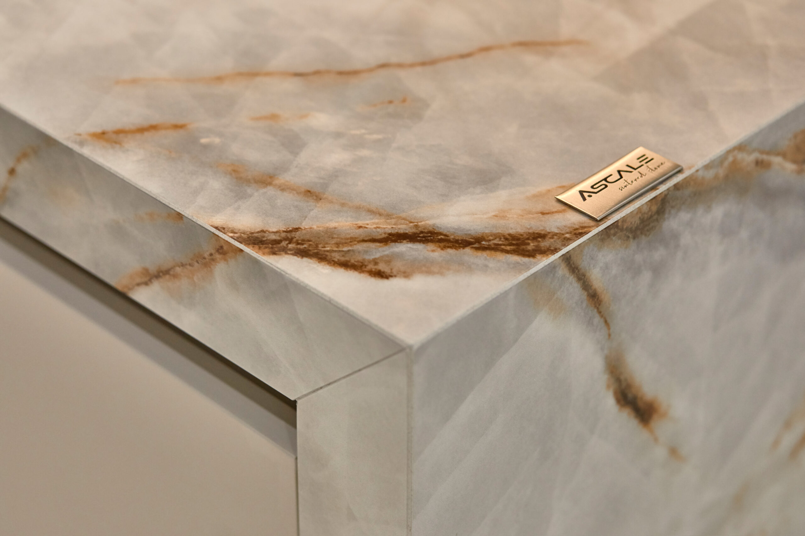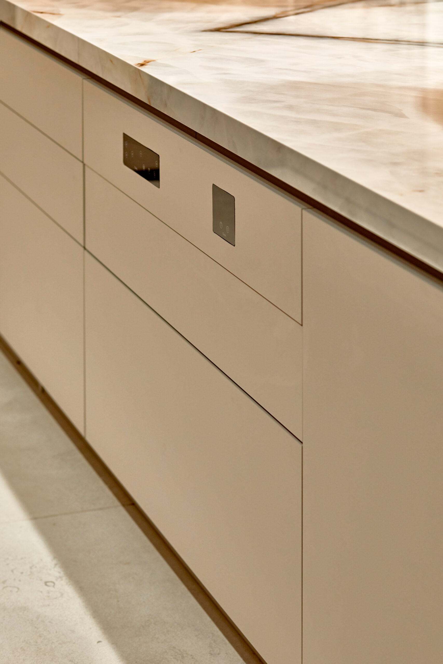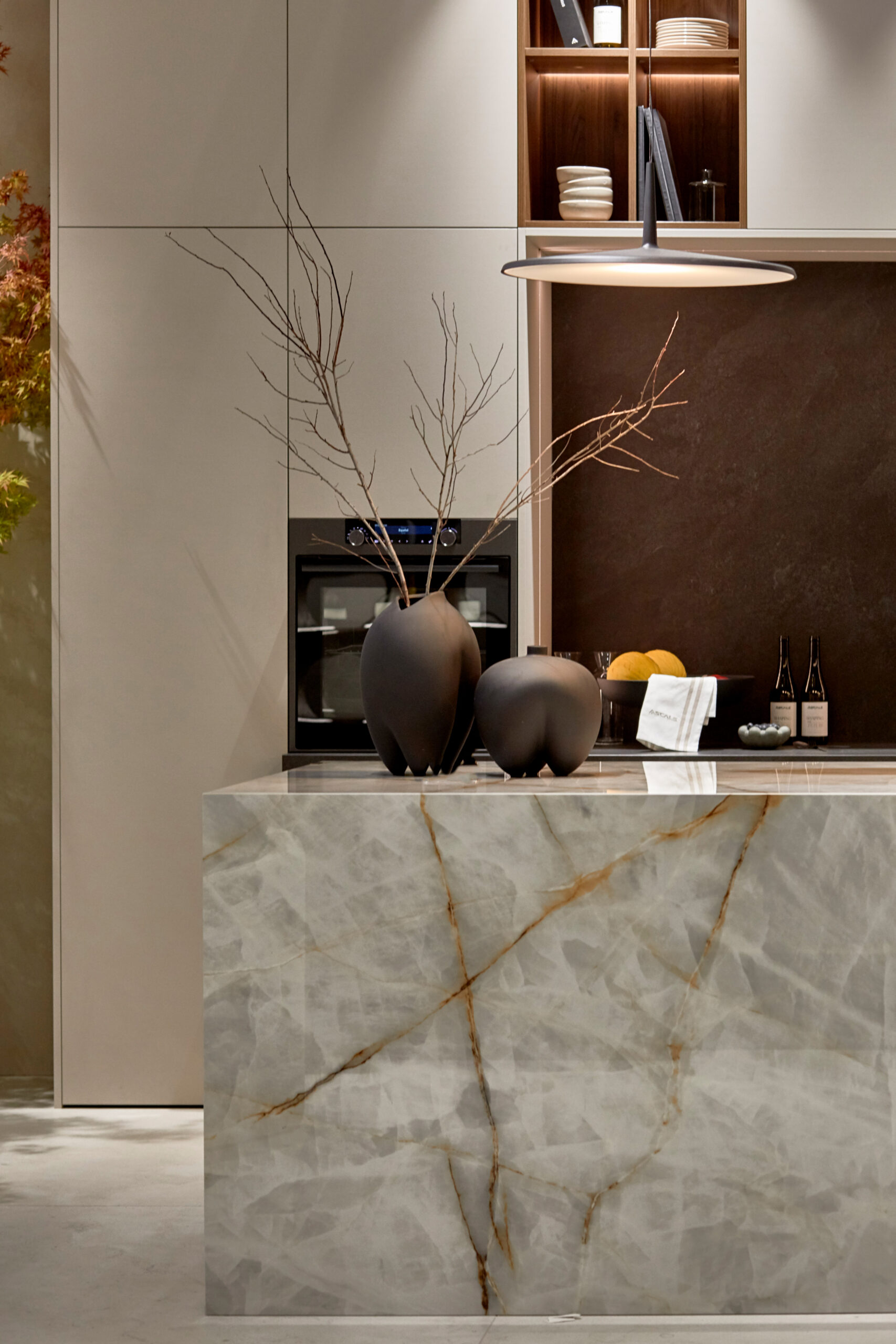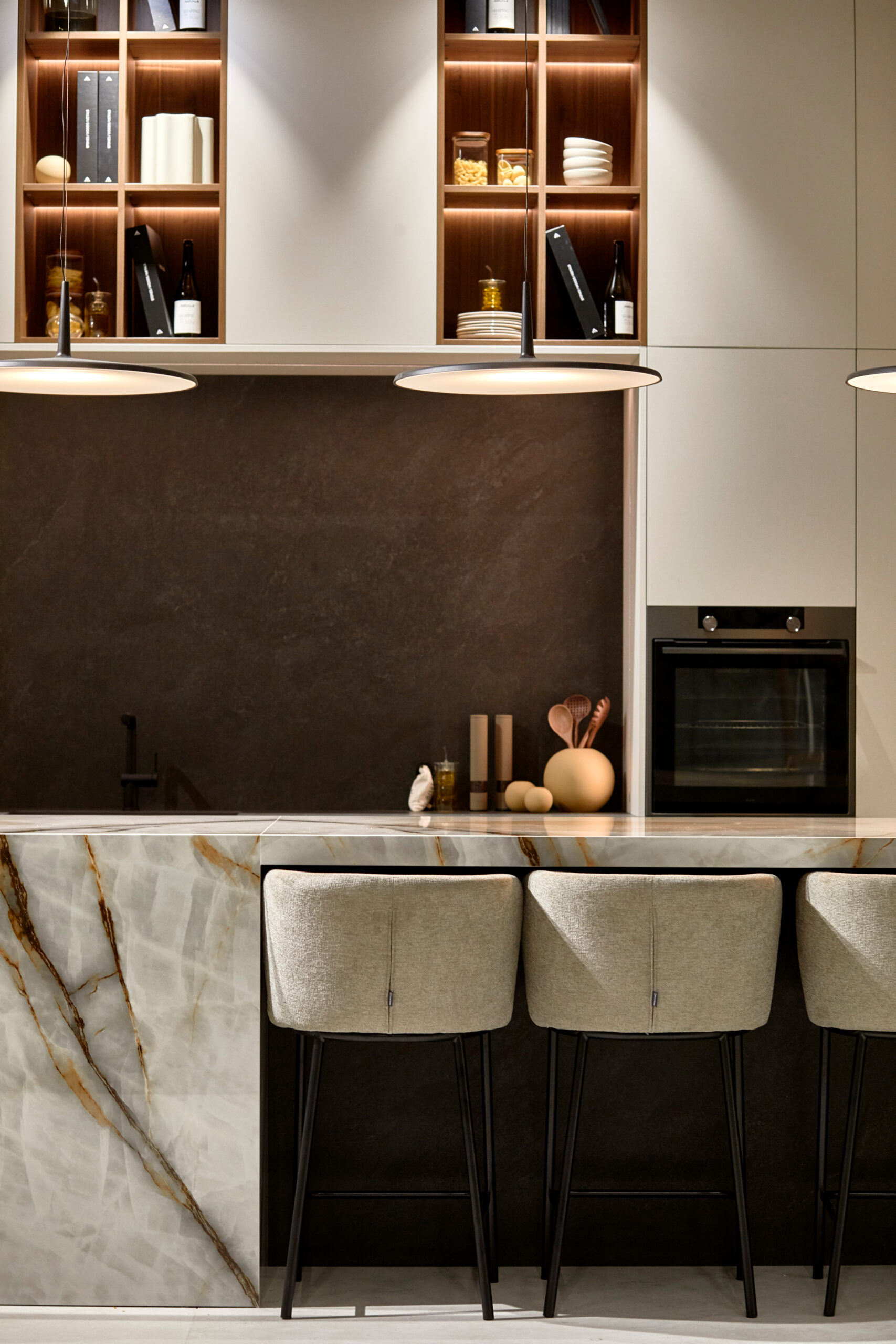 El corazón de la cocina lo ocupa una isla de gran impacto visual, que combina los frentes GOURMET acabado GINGER con la superficie Aura Lux White de Ascale, inspirada en las vetas del ónice. Este bloque continuo envuelve encimera, costados y trasera, integrando además un sistema de inducción invisible. El resultado es una pieza escultórica que aporta luz, dinamismo y una elegancia atemporal al conjunto.