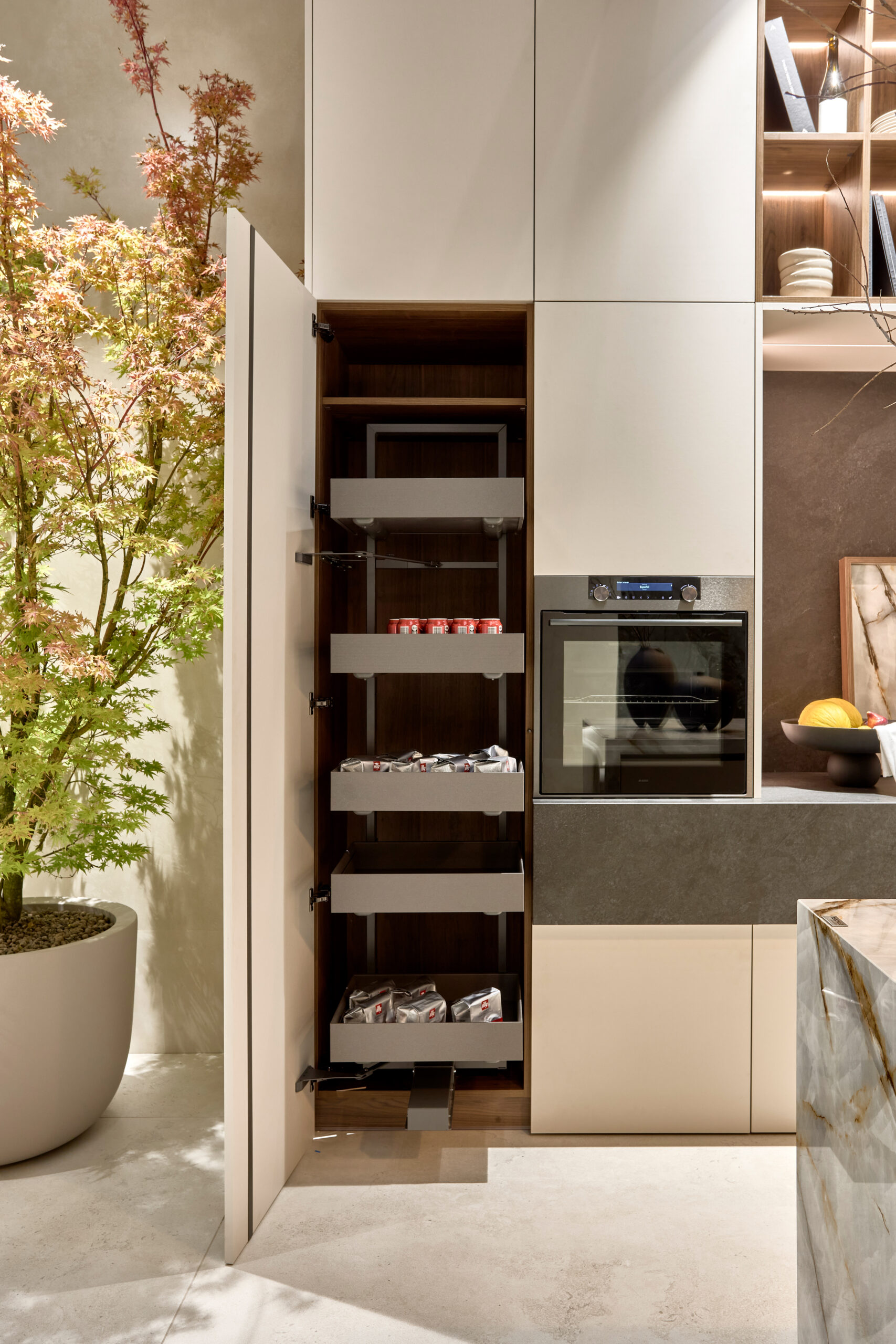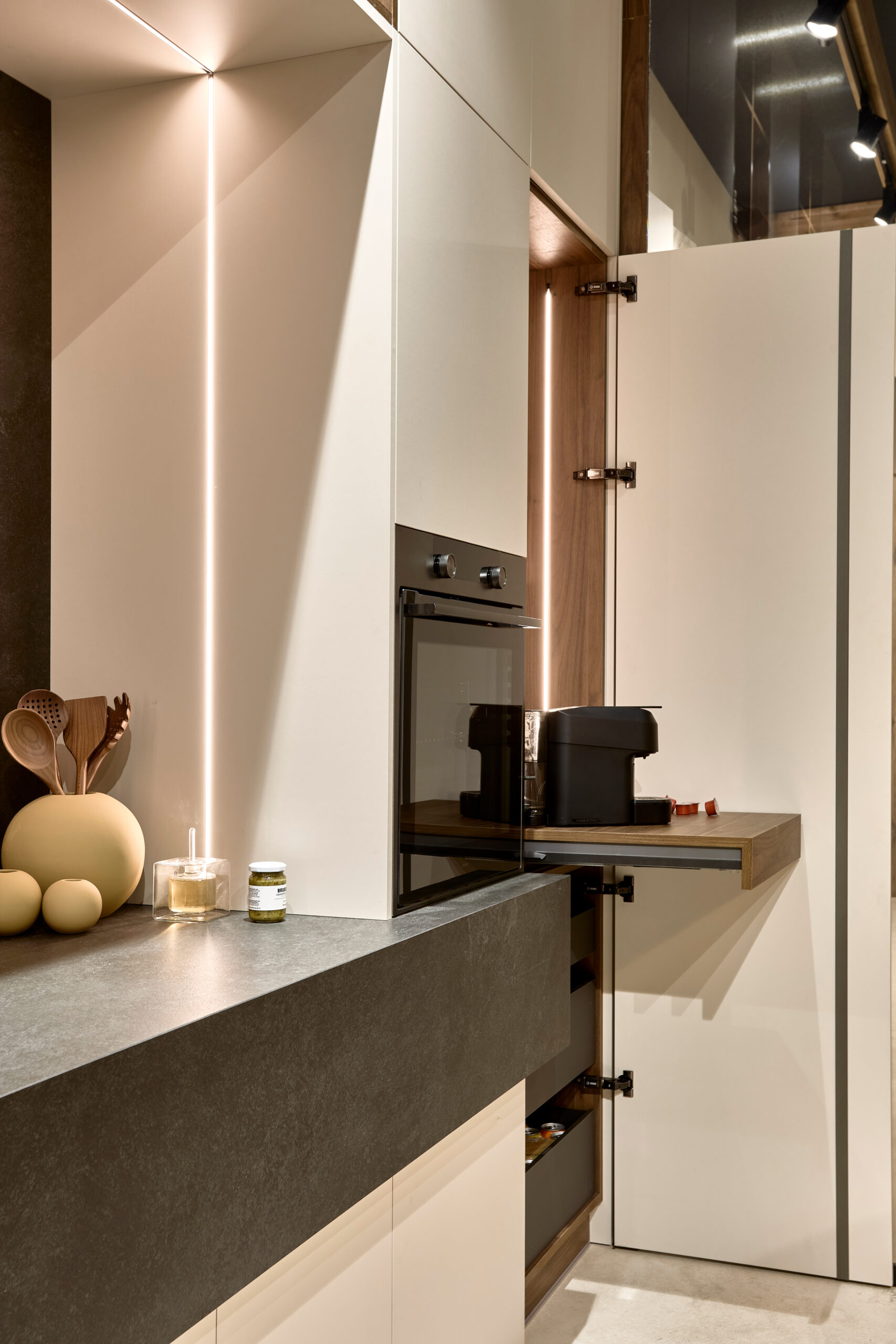 El conjunto integra soluciones pensadas para el uso diario y el máximo aprovechamiento del espacio. Destaca el sistema Maxi Urban, una columna extraíble de gran capacidad, y un mueble desayunador con balda extraíble e iluminación LED Orión, diseñada con una inclinación hacia el interior que aporta un mayor confort visual. Elementos que combinan tecnología, practicidad y estética en un mismo concepto.