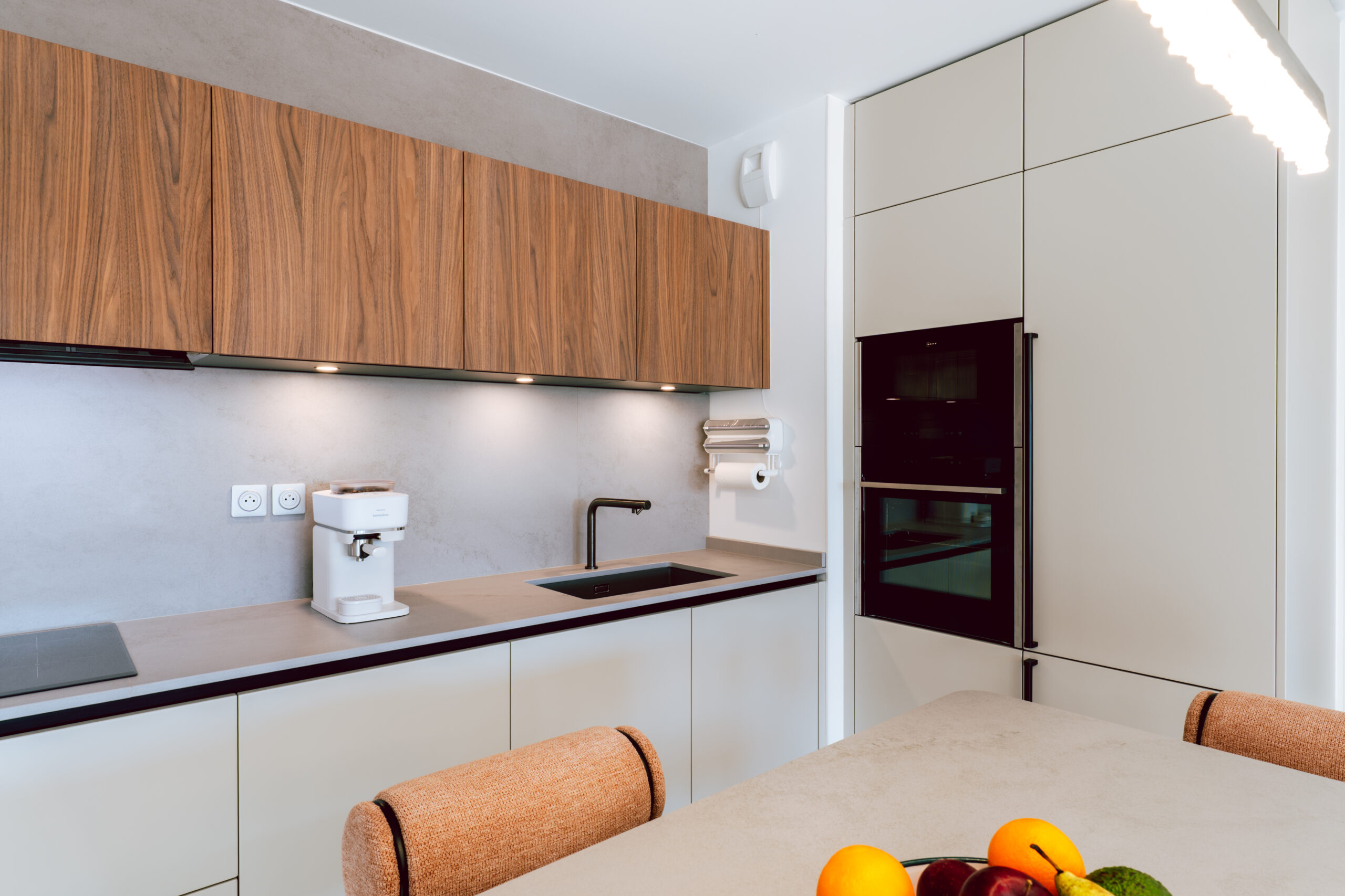 Este proyecto, desarrollado por Depetris Design, distribuidor de INKO en Aix-en-Provence, en Francia, presenta una cocina luminosa y bien estructurada donde cada elemento se integra con naturalidad. La propuesta combina líneas puras y materiales cálidos, creando un espacio equilibrado, contemporáneo y acogedor.