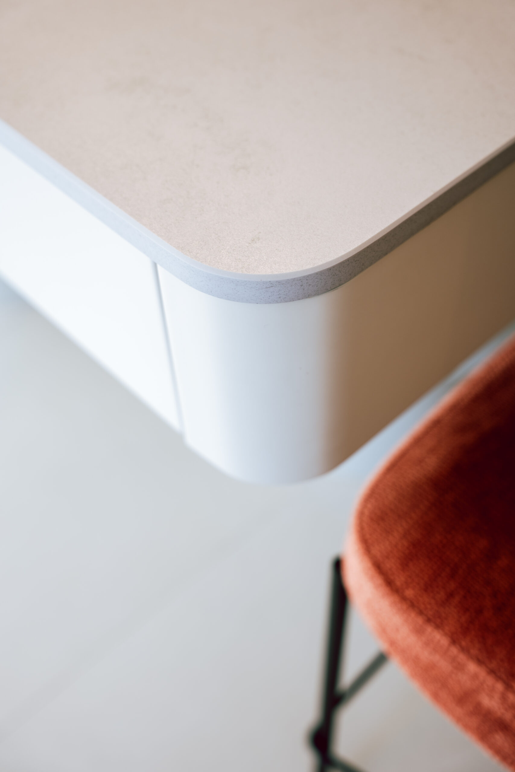 La isla central introduce el gesto más distintivo del proyecto. Su forma curva suaviza la geometría del conjunto y genera un punto de encuentro cómodo y funcional.