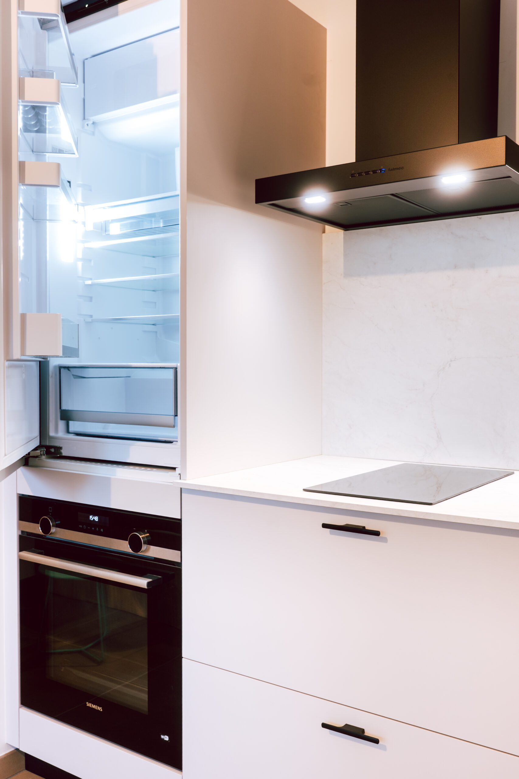 En el frente principal se articula la zona técnica de la cocina. La zona de cocción, equipada con placa Siemens y campana Falmec, se integra de forma discreta dentro del conjunto.