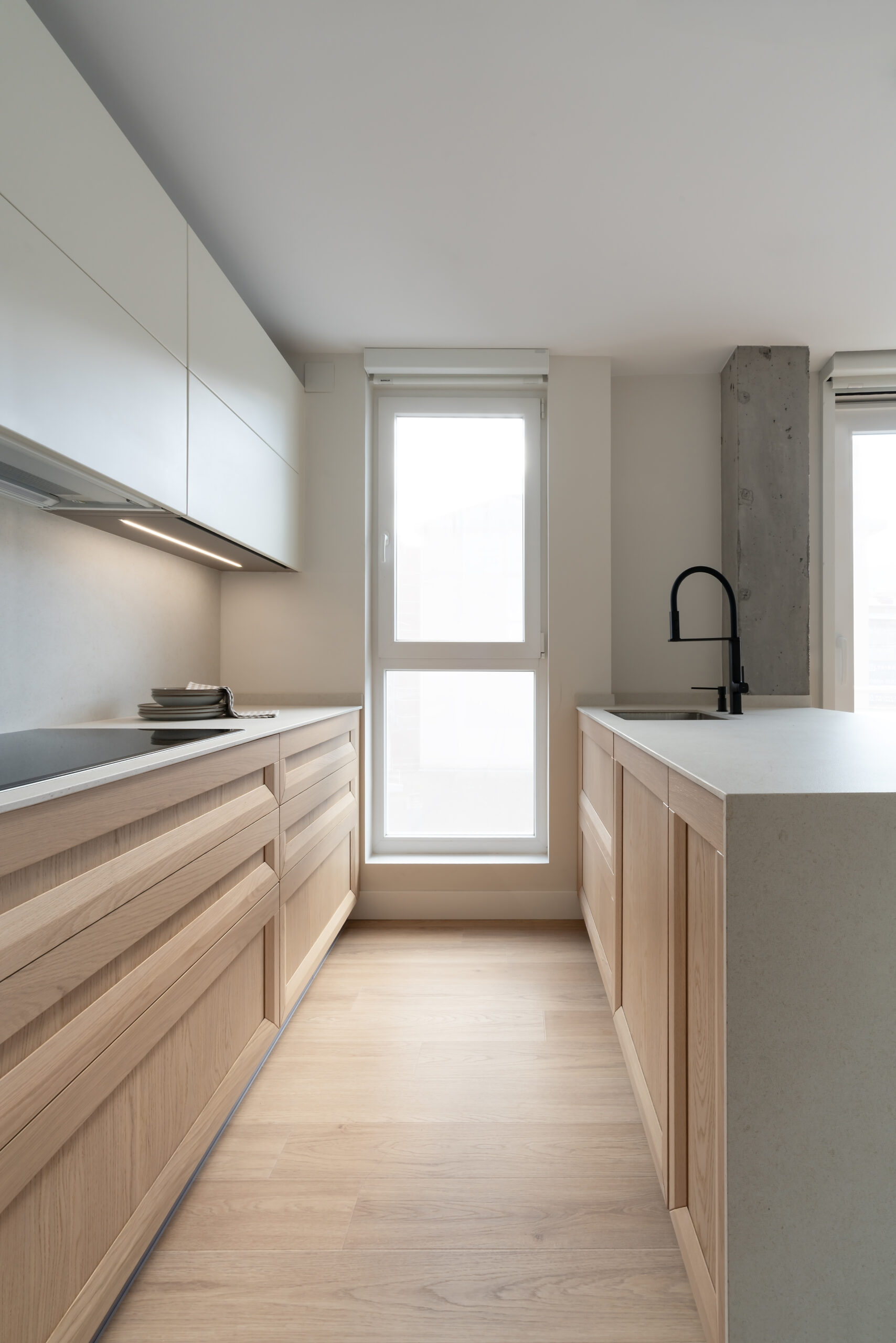 La personalidad de la cocina se define por el modelo KIEV de INKO, presente en todos los muebles bajos y en la península. Este modelo se caracteriza por su marco macizo de roble y plafón rechapado con tableado vertical, aportando textura y profundidad visual.