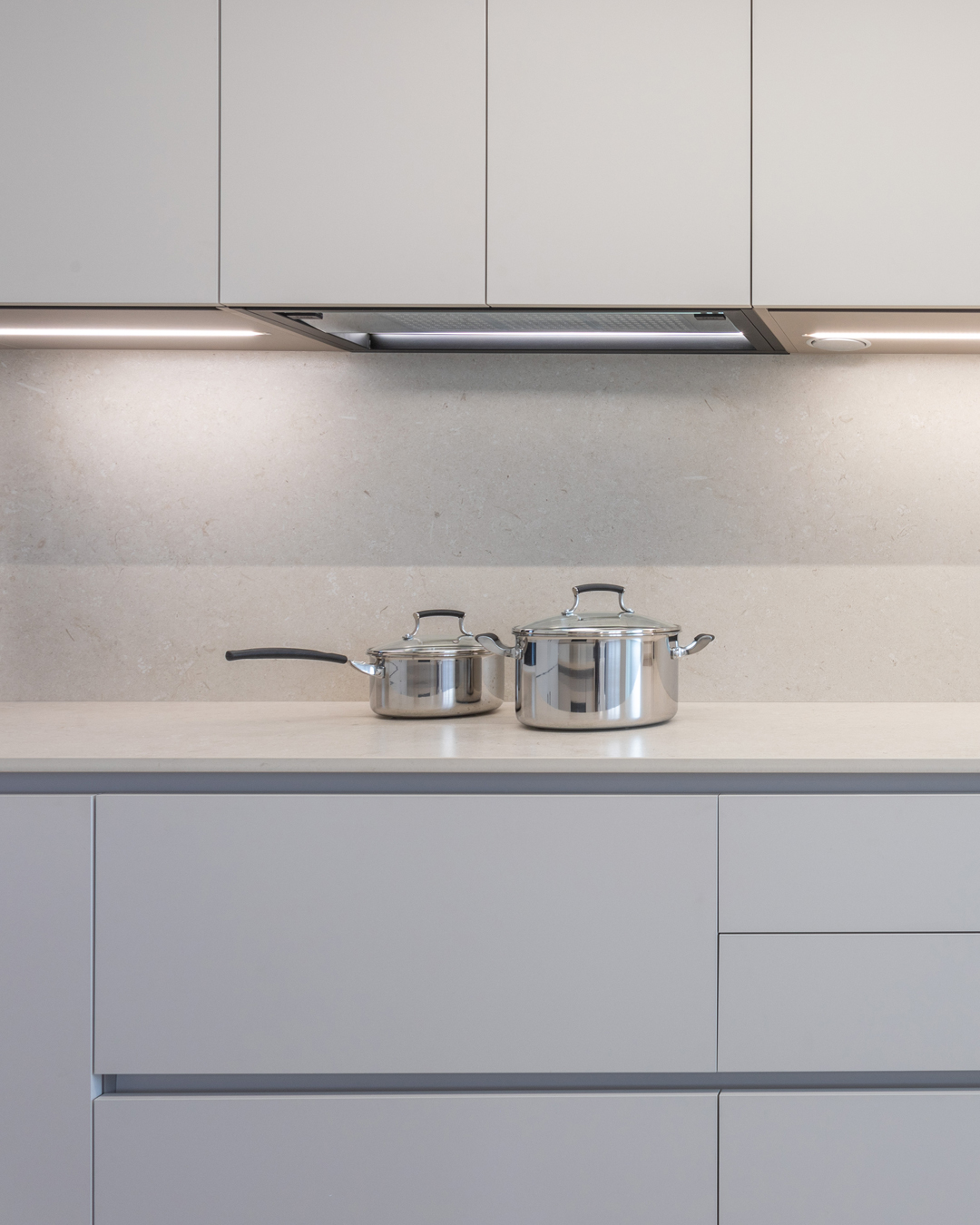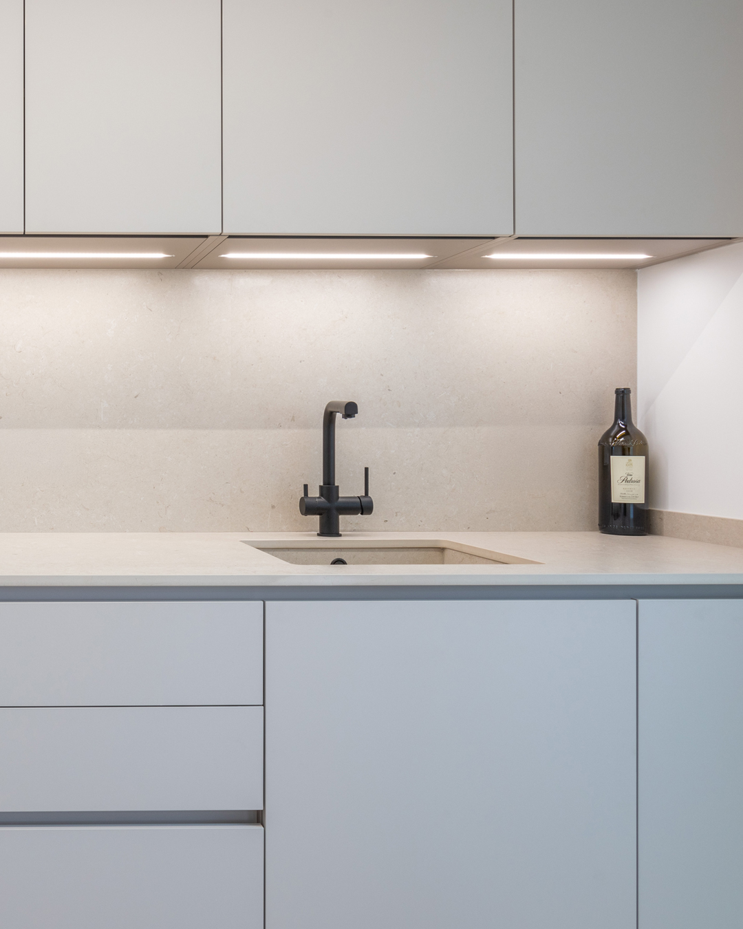La zona principal de trabajo incorpora la placa invisible de Cooking Surface y el área de aguas. Los muebles altos hasta el techo, junto con la campana integrada de Pando, contribuyen a mantener una estética limpia y ordenada, al tiempo que optimizan la capacidad de almacenamiento.