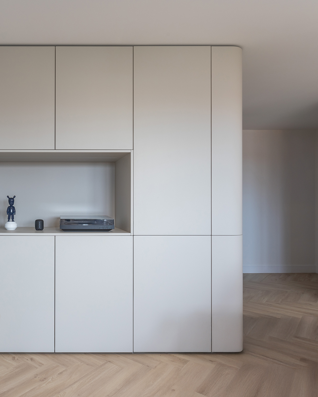 El proyecto se completa con un mueble a medida en el salón, realizado también en el modelo SENA 22, que combina zonas cerradas con un hueco decorativo abierto y remates curvos. Esta solución mantiene la coherencia estética entre cocina y zona de estar.