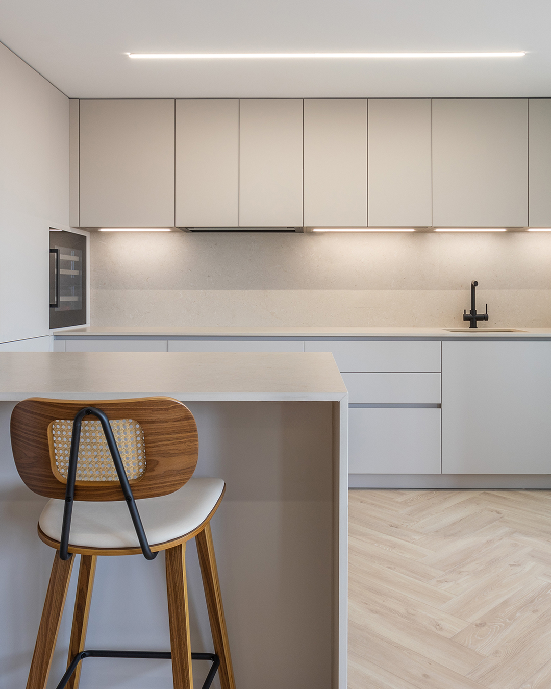 Al acceder a la vivienda, un mueble curvado en el modelo SENA 22 lacado en acabado nude actúa como elemento de transición entre la entrada y la cocina. Este volumen introduce suavidad en el conjunto y aporta personalidad al espacio.