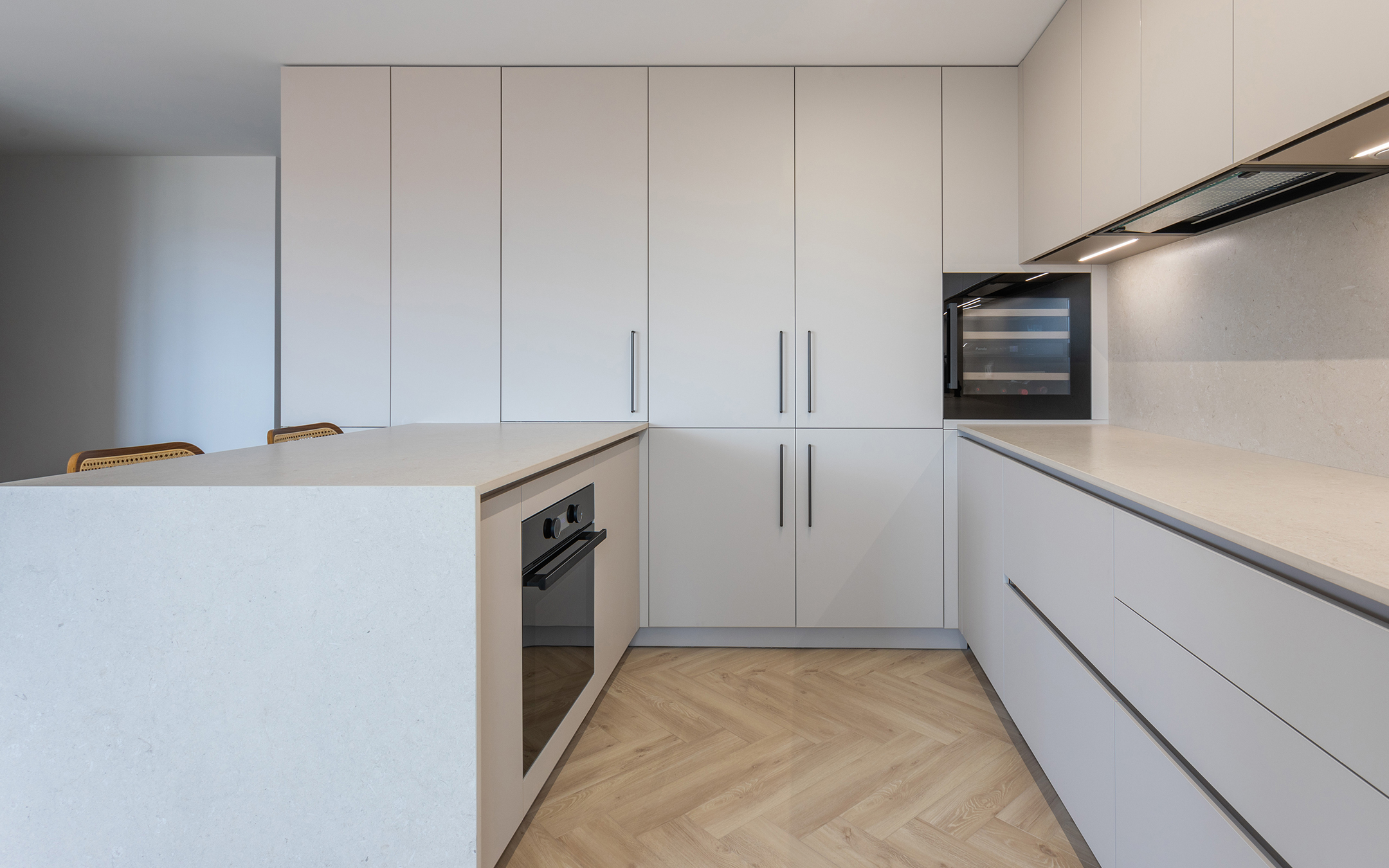 La cocina se organiza mediante una distribución en U, que permite estructurar el espacio en distintas áreas de trabajo. Desde la zona de columnas se proyecta una península que integra el horno y que, en su cara posterior, incorpora una barra al mismo nivel que la encimera, ideal para colocar taburetes y crear un espacio informal.