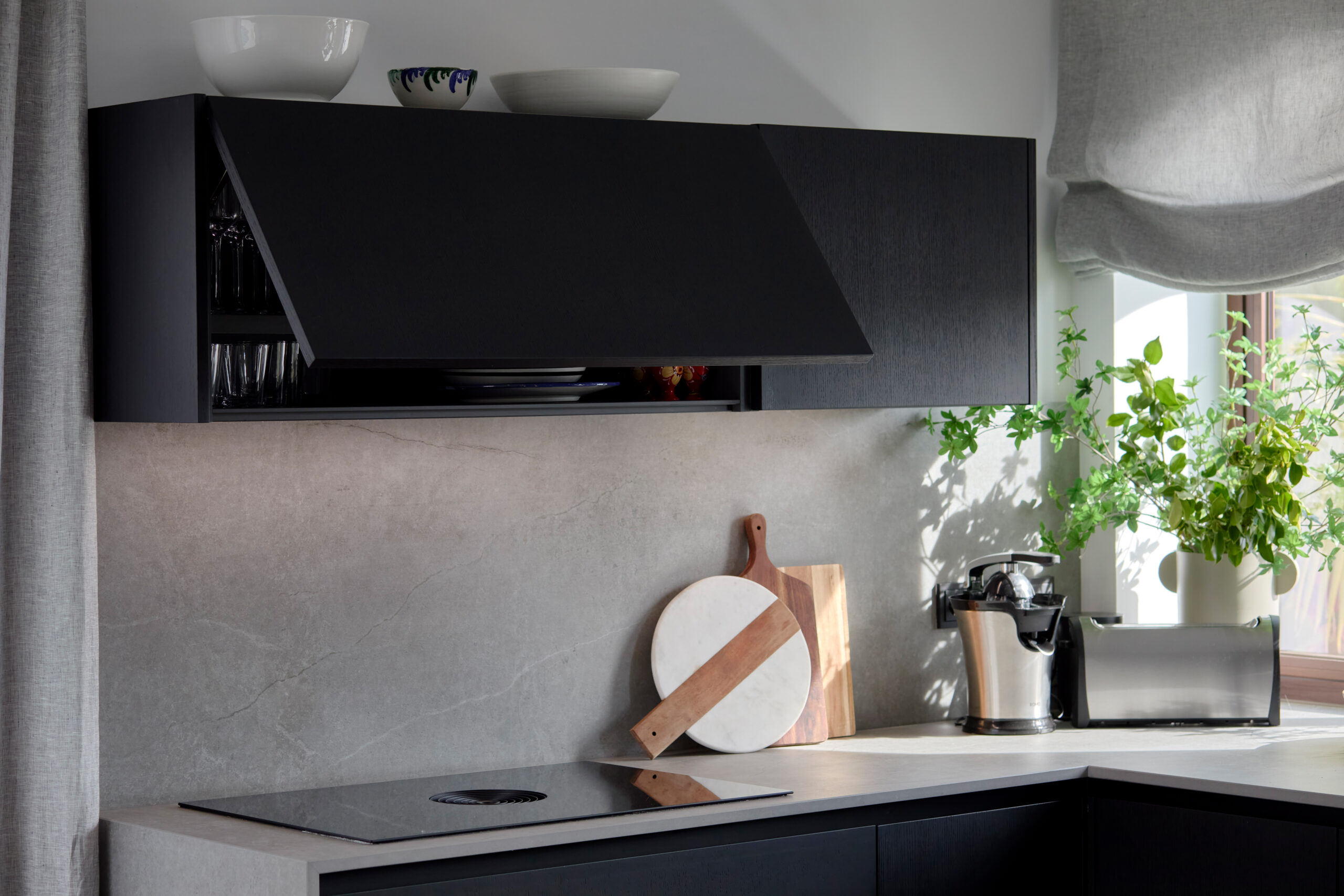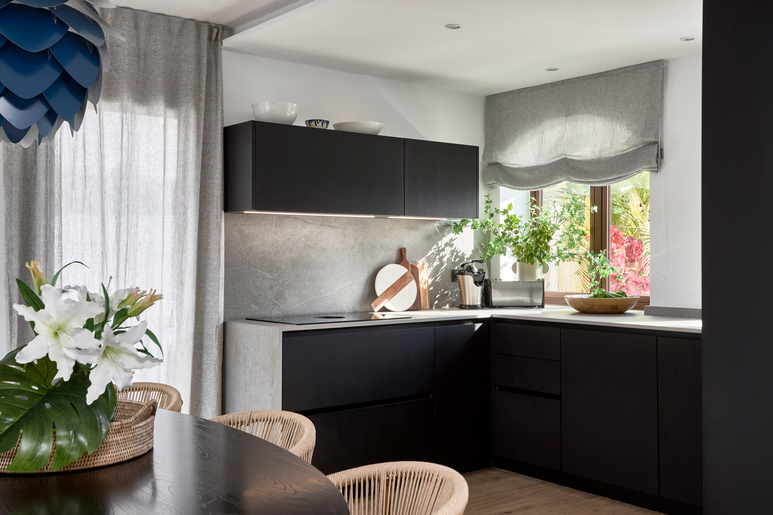 El mobiliario combina nuestros modelos TIBET y BAIKAL en madera natural tintada en negro, aportando textura y profundidad visual. El diseño se resuelve sin tiradores mediante sistema gola, con la única excepción del frigorífico, que incorpora tirador tipo asa para facilitar su uso. La encimera en Dekton Soke, de inspiración cemento, envuelve la superficie de trabajo, el frente y el lateral de la zona de cocción, generando continuidad material y una sensación de volumen compacto.