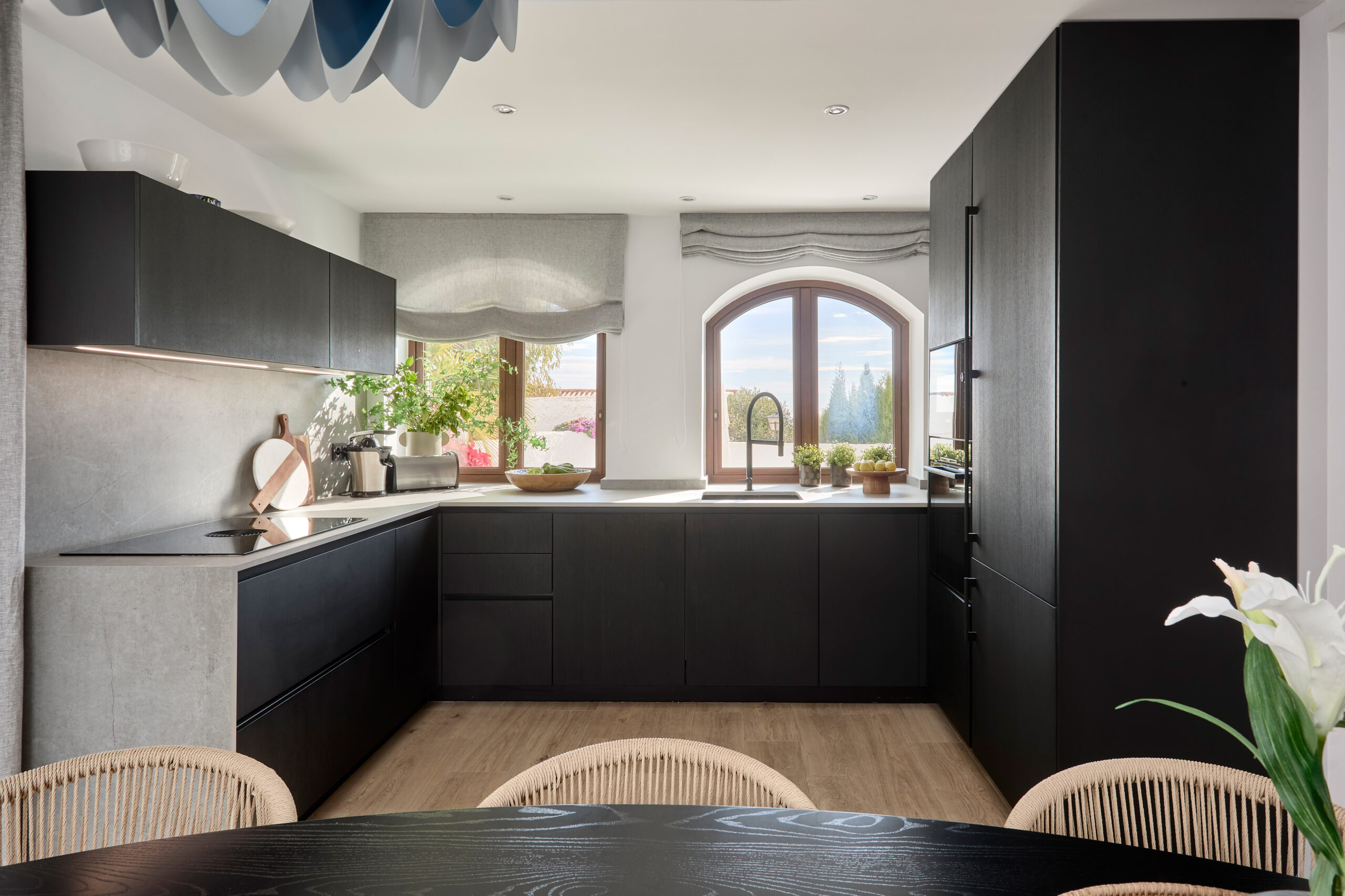 En esta cocina, la profundidad de la madera oscura y la entrada de luz natural construyen un ambiente sereno y equilibrado desde el primer instante. El espacio se abre al comedor generando continuidad entre arquitectura y mobiliario, reforzando una conexión fluida tanto en el interior como hacia el exterior a través de las ventanas.