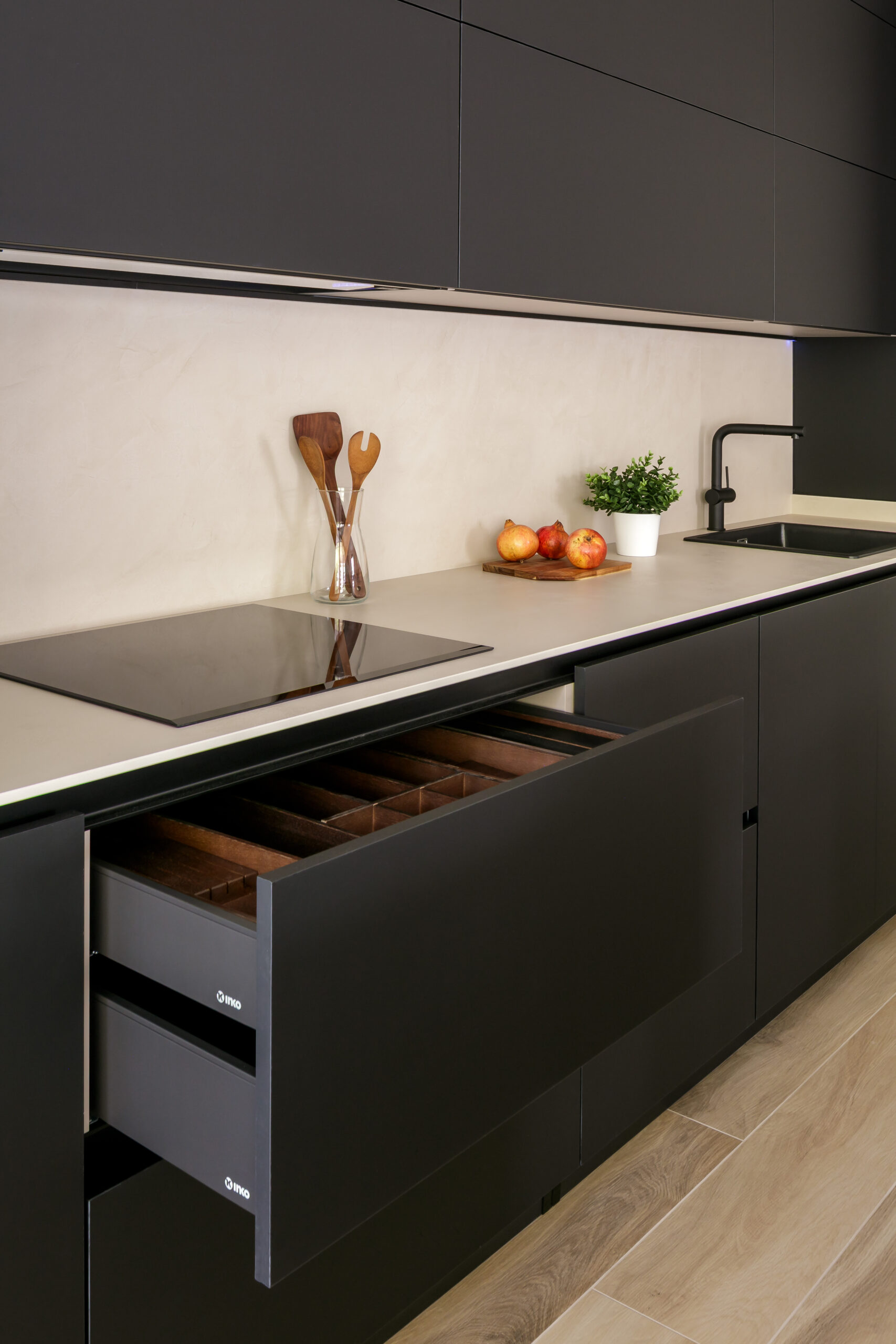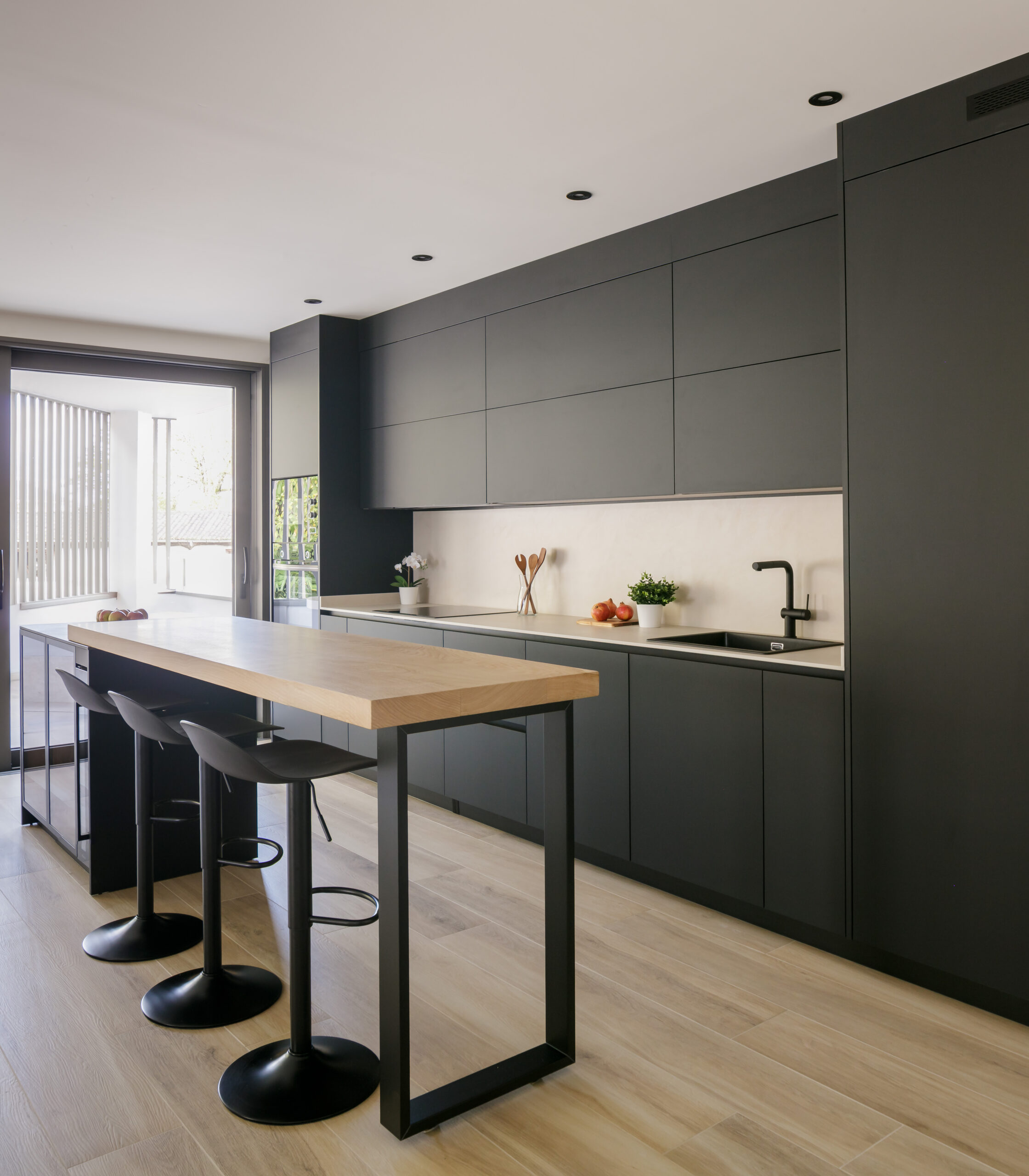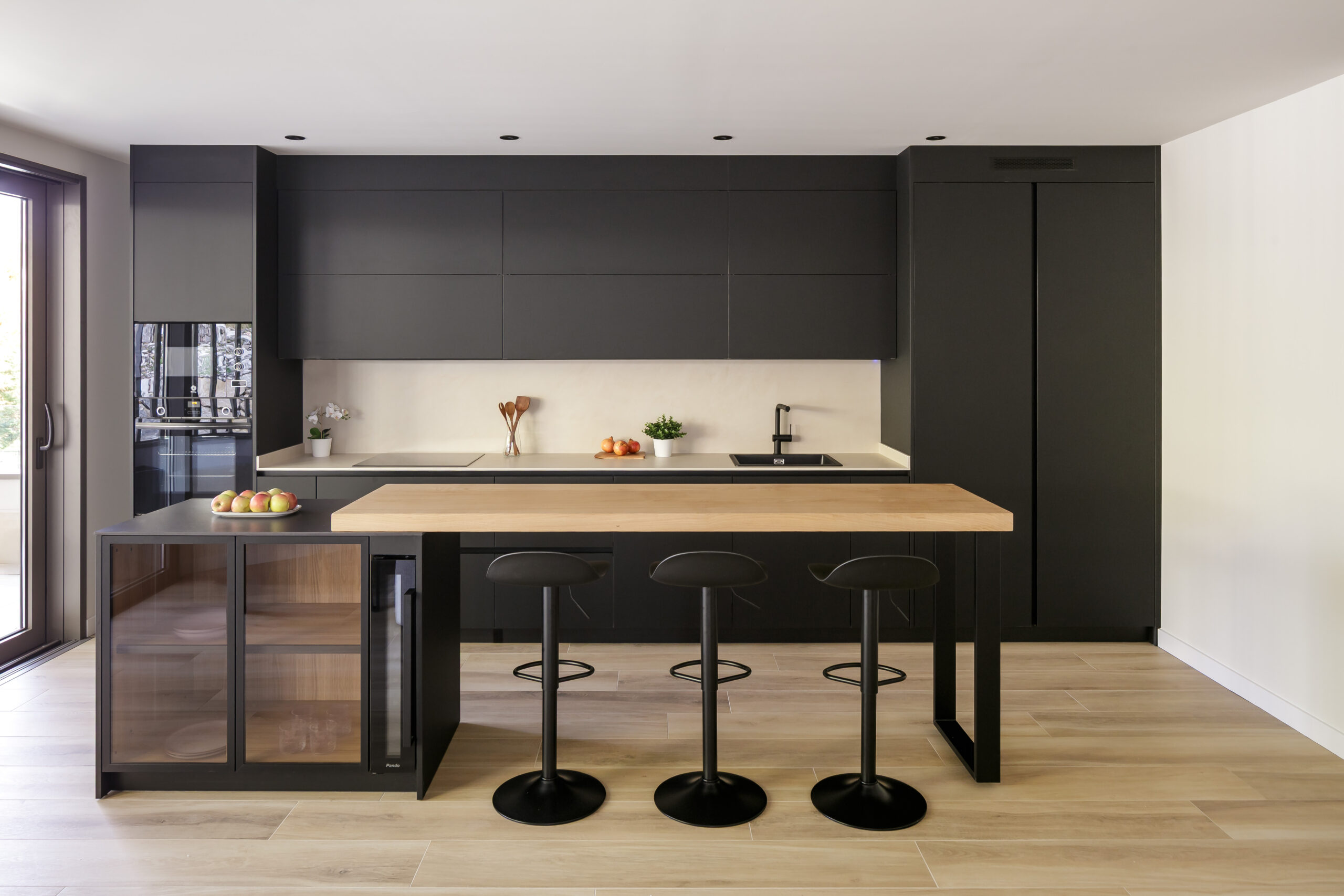 Los frentes del mobiliario de INKO, modelo SMART en acabado negro mate con sistema gola, aportan una presencia sobria y elegante que dialoga con la encimera y el aplacado en Dekton Nacre, creando una base neutra y sofisticada.