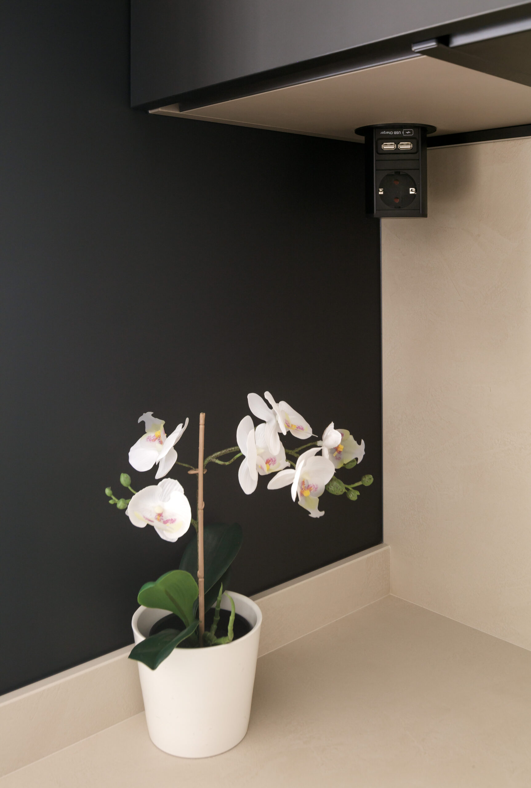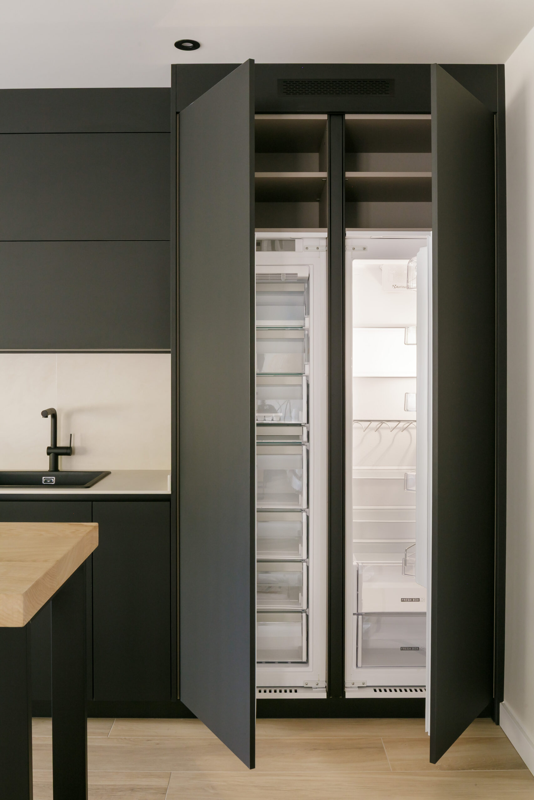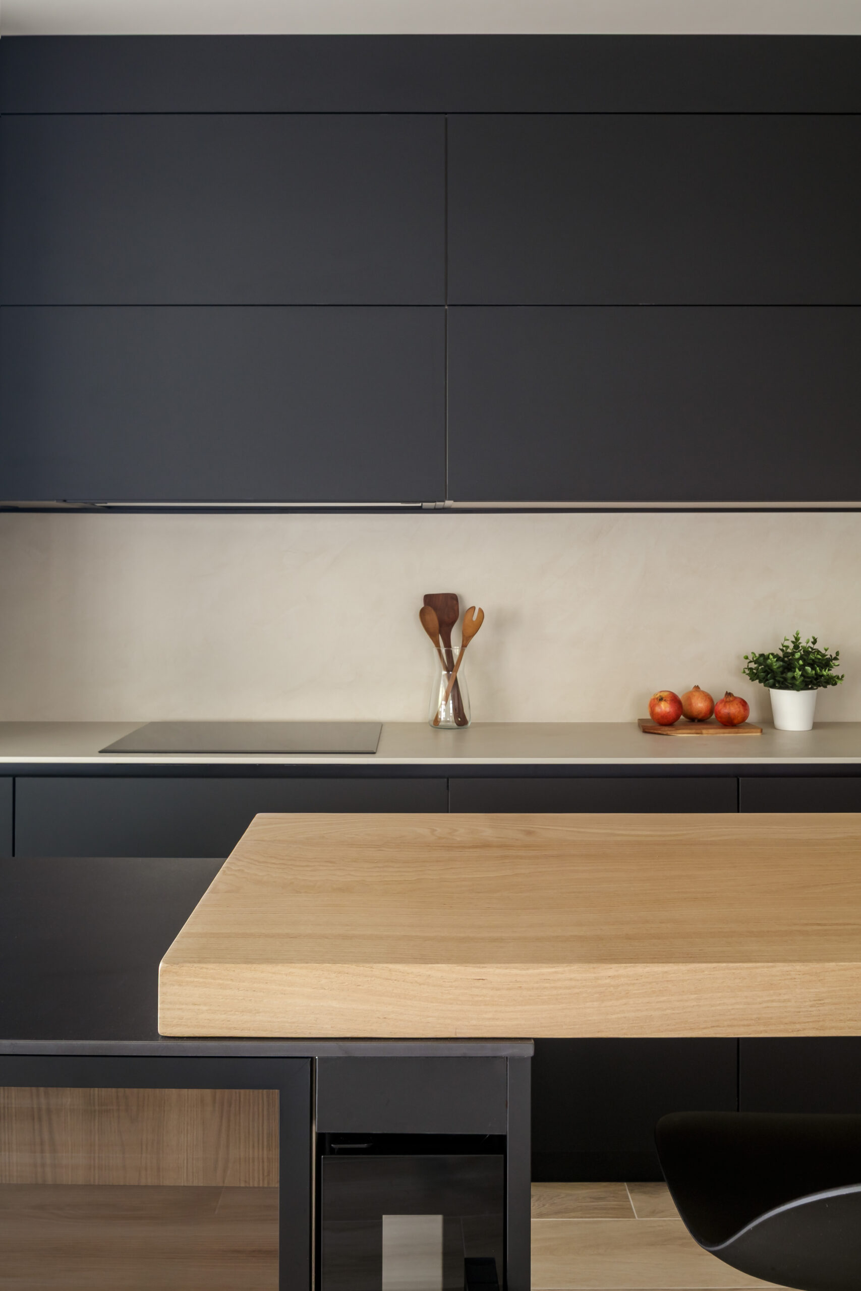 Los frentes del mobiliario de INKO, modelo SMART en acabado negro mate con sistema gola, aportan una presencia sobria y elegante que dialoga con la encimera y el aplacado en Dekton Nacre, creando una base neutra y sofisticada.