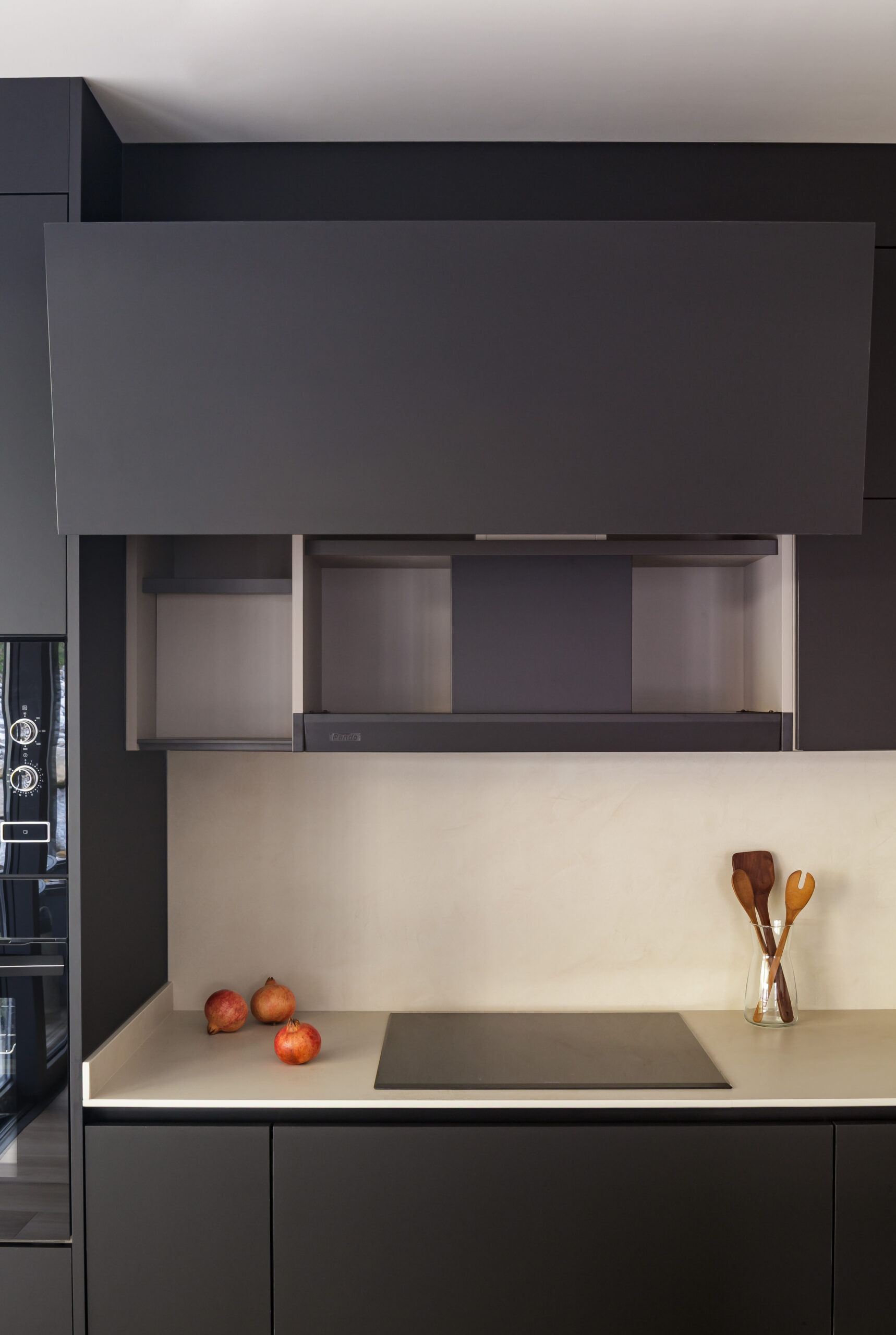 En la zona de cocción, placa y campana de Pando se integran como una solución conjunta, discreta y eficiente. La zona de aguas se completa con fregadero Schock y grifería Gessi Inedito, manteniendo coherencia estética en materiales y acabados.
