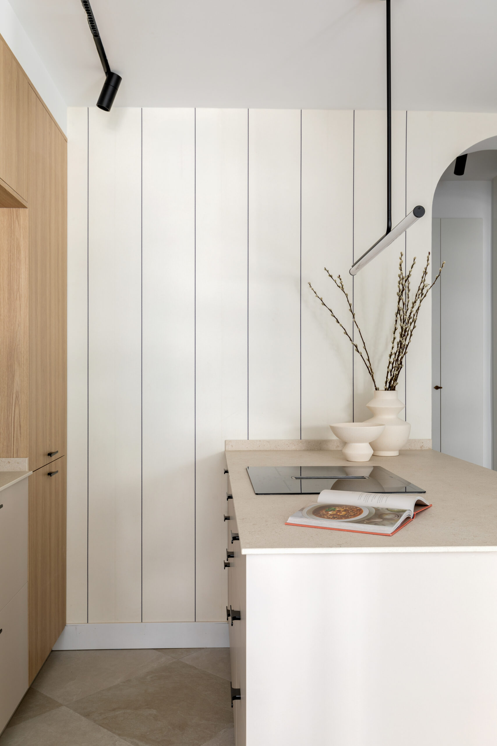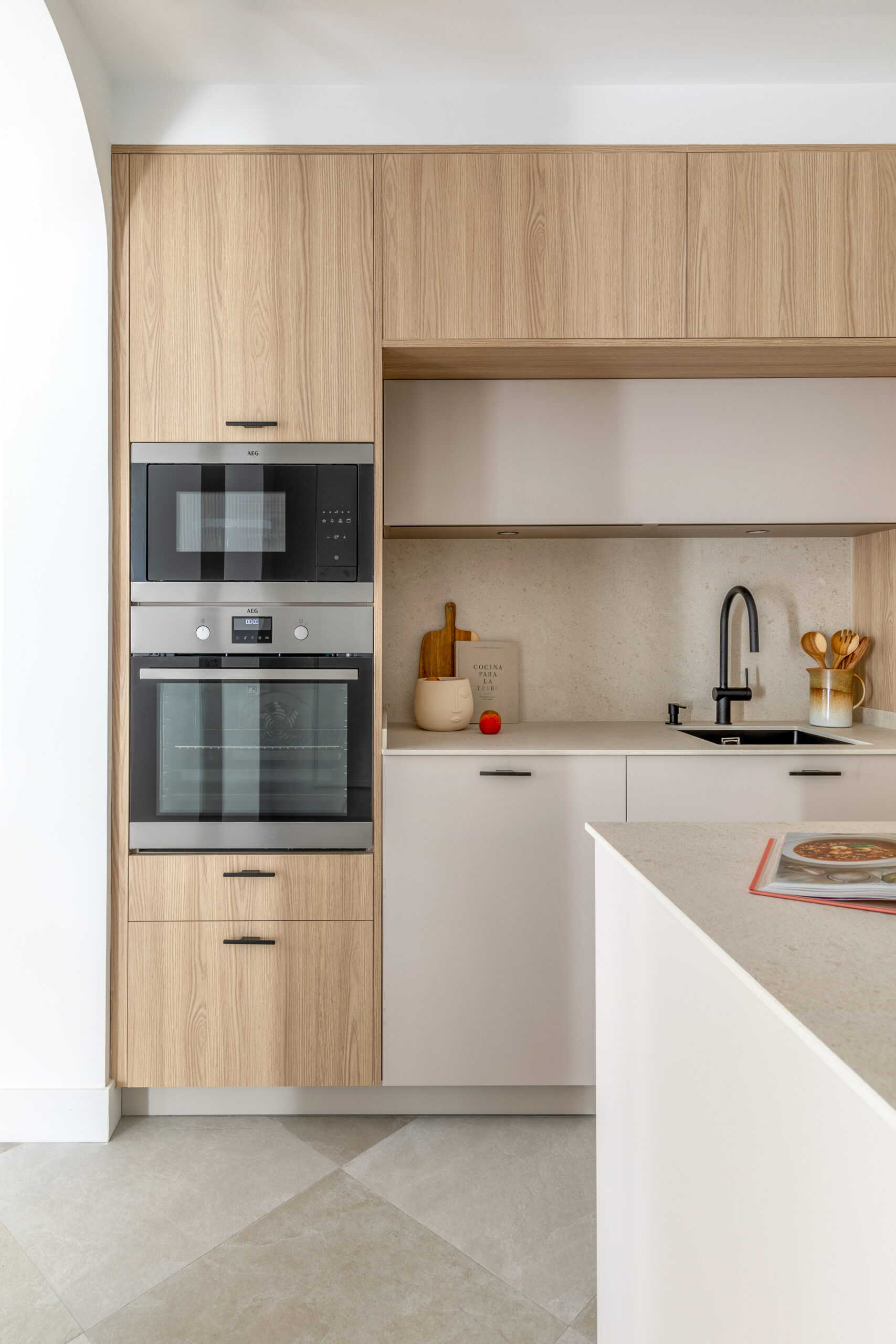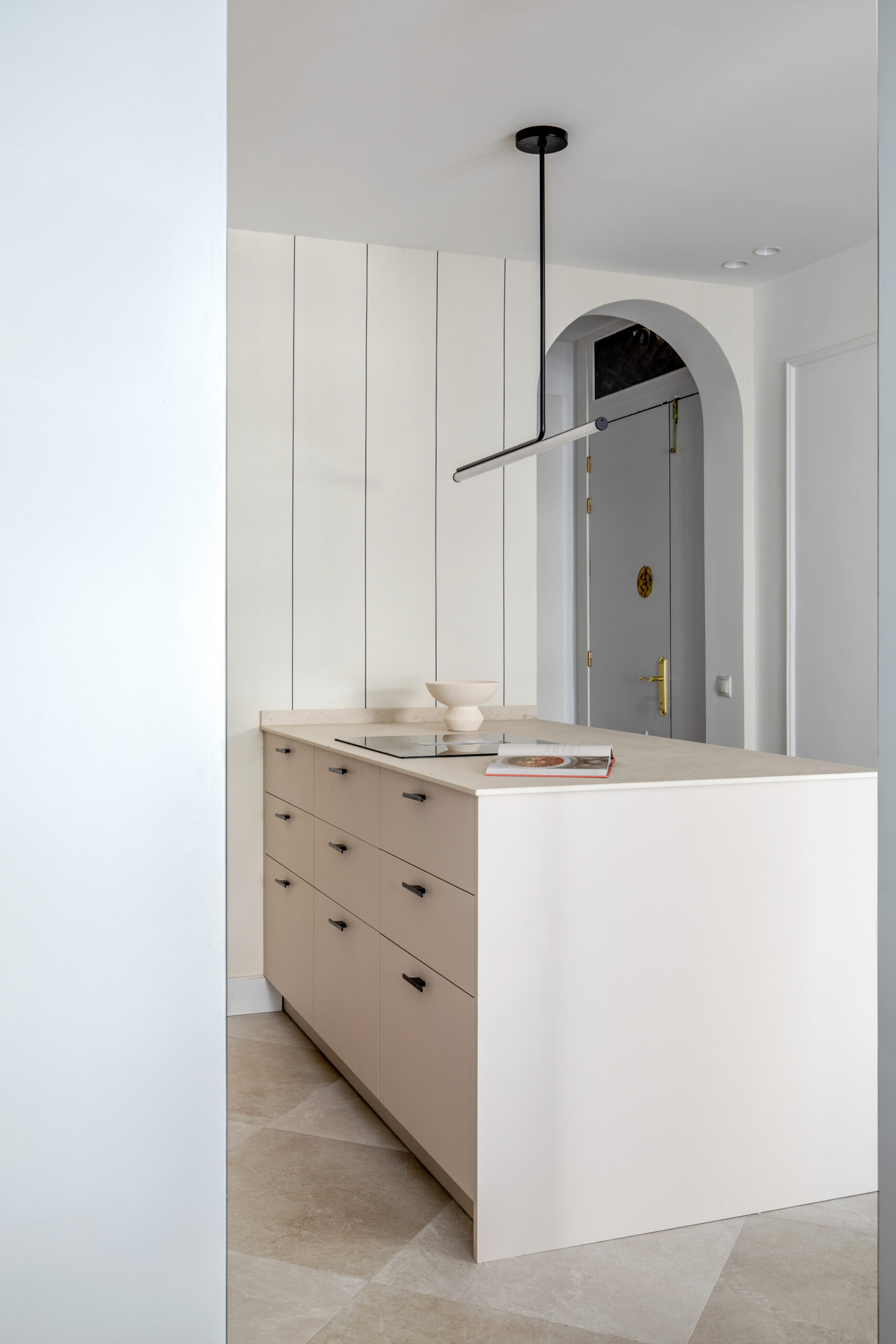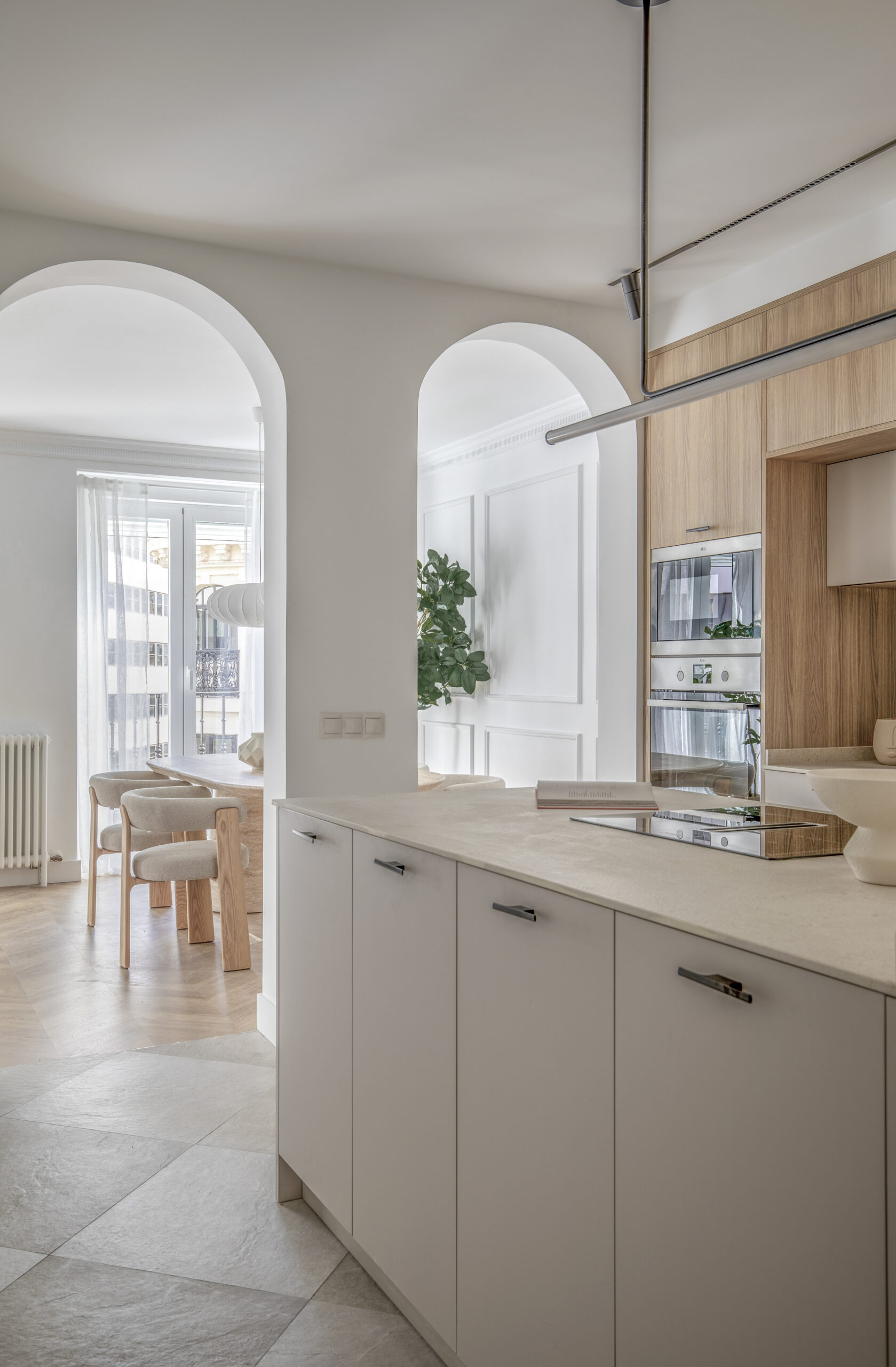 Este proyecto de interiorismo, firmado por Cristina Puerta Estudio, encuentra en esta cocina de INKO el equilibrio entre orden, serenidad y diseño contemporáneo. El espacio se conecta con el salón mediante arcos arquitectónicos que refuerzan la continuidad visual y generan una atmósfera fluida, donde cocina y zona de estar conviven con naturalidad.