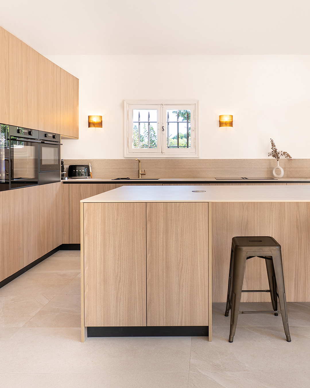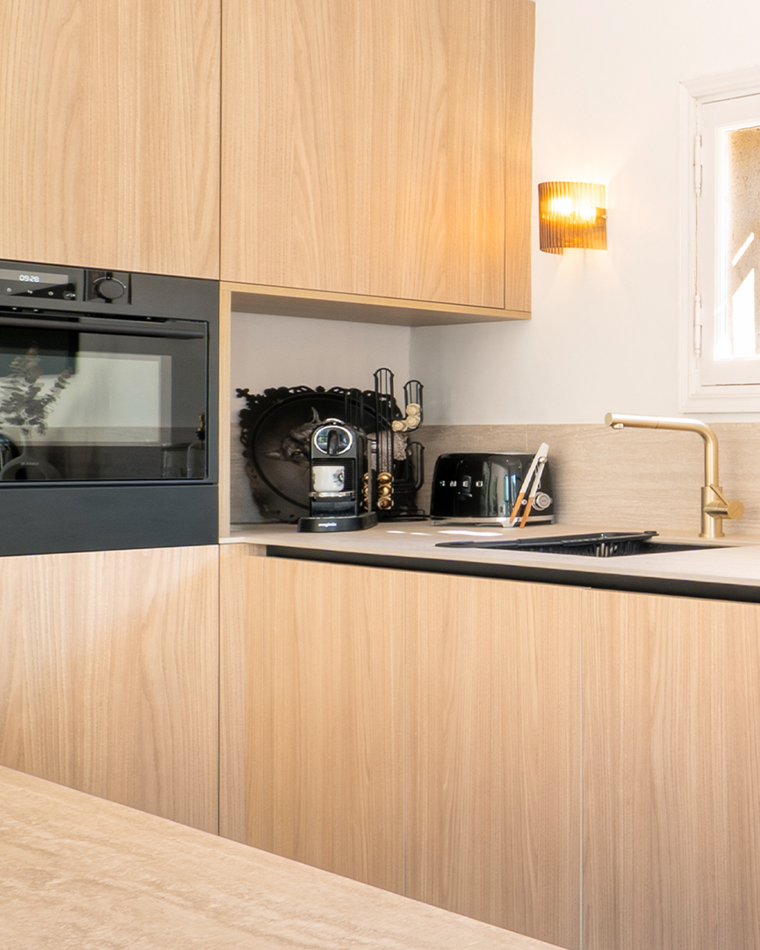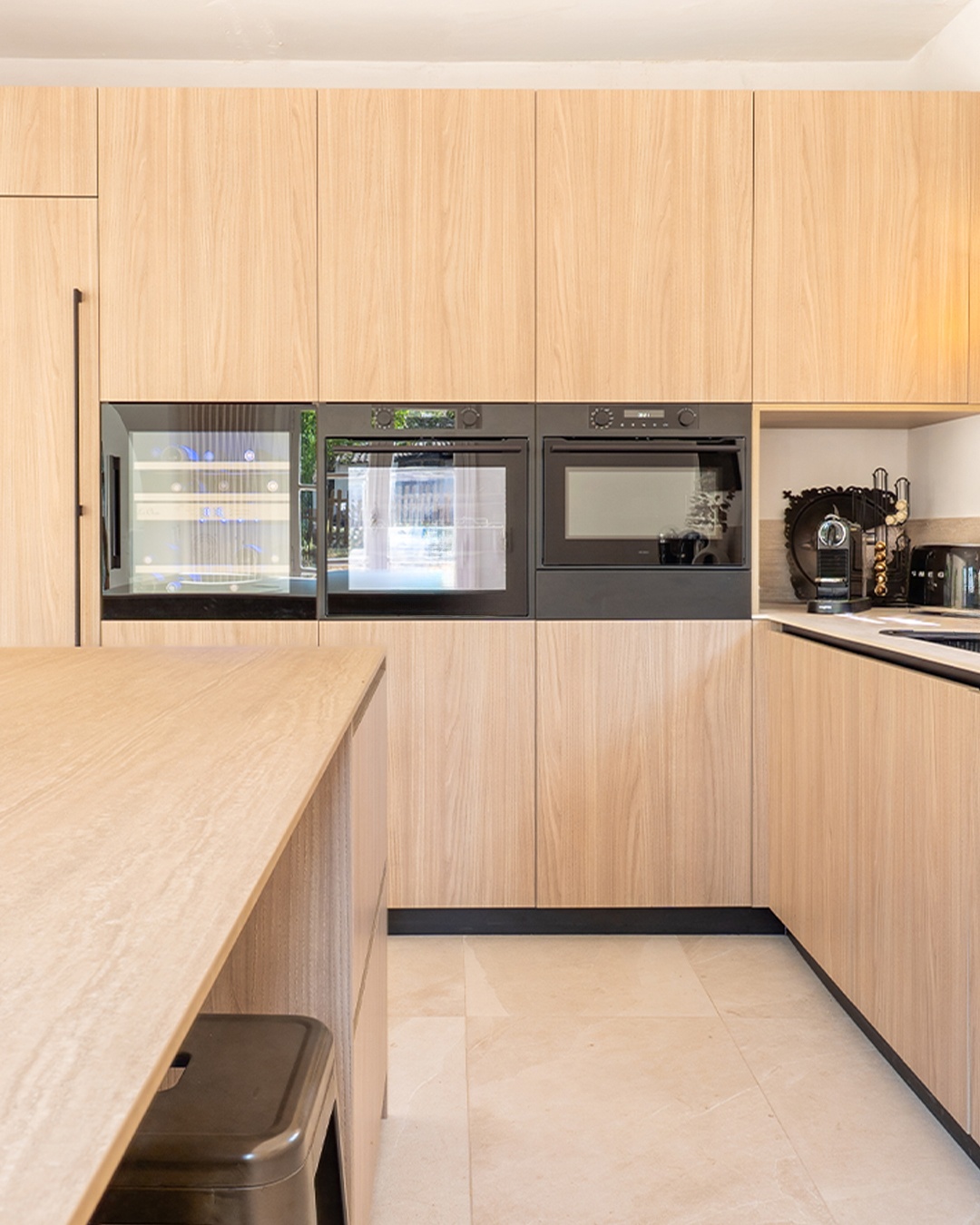 Las columnas están meticulosamente organizadas para una integración total: albergan la zona de frío, los hornos y, estratégicamente, un hueco auxiliar pensado para mantener los pequeños electrodomésticos fuera de la vista.